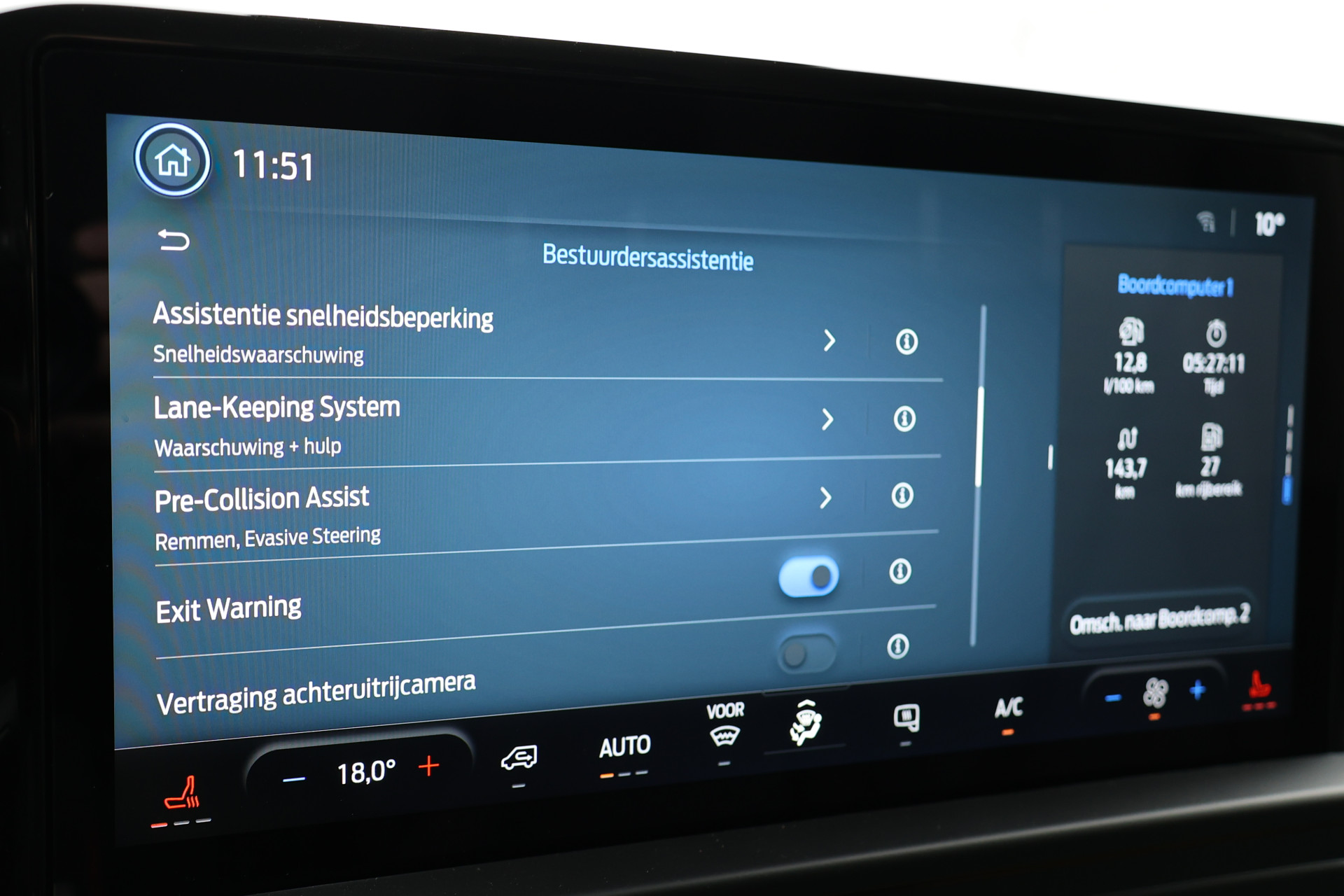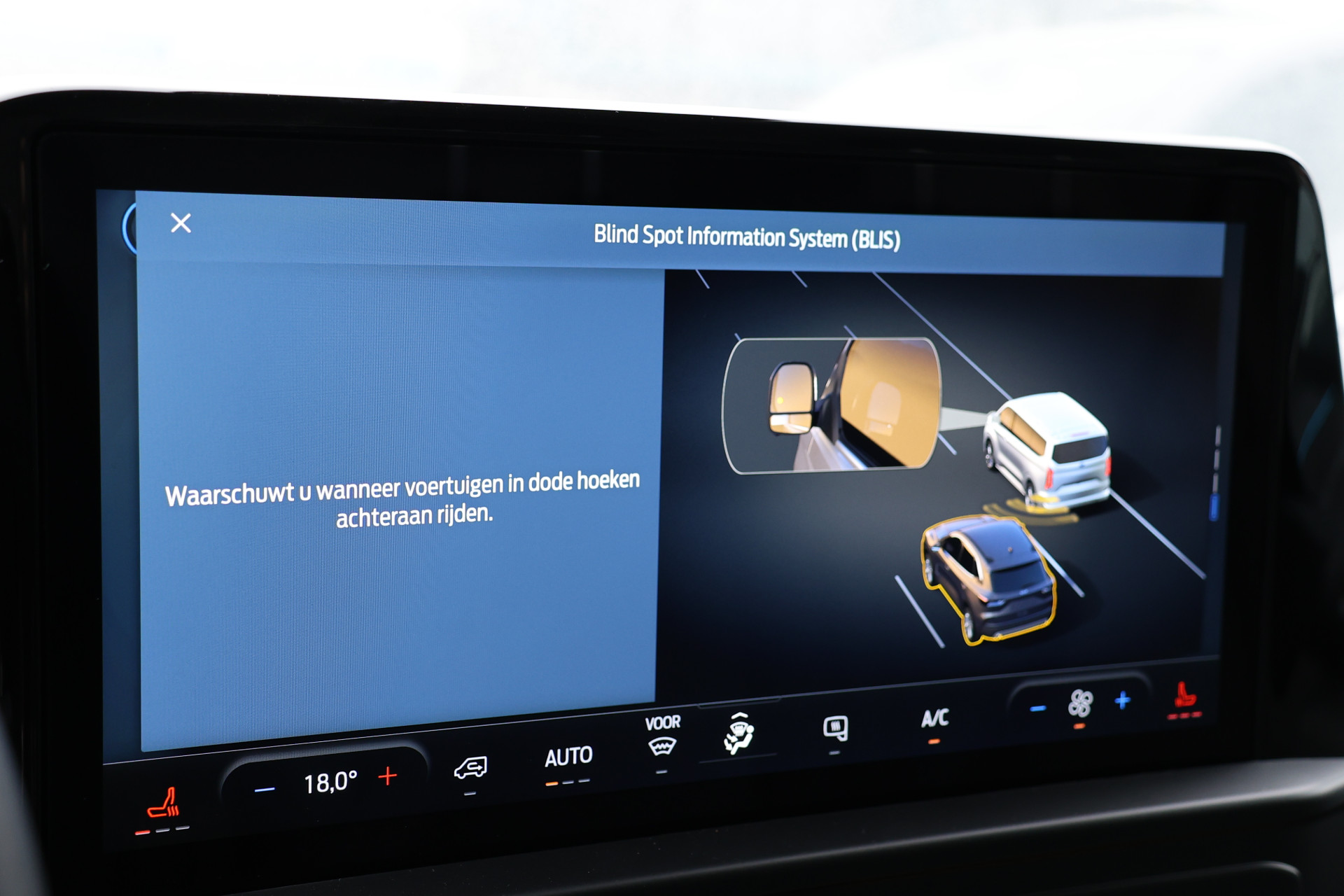 Aan boord van deze Ford houden verschillende geavanceerde systemen voor u de weg in de gaten. Ze waarschuwen u voor noodsituaties en kunnen in een aantal gevallen ook zelf ingrijpen. Dat de auto steeds meer taken van de bestuurder overneemt, merkt u bijvoorbeeld aan het systeem voor verkeersbord-detectie in deze Ford. Onbedoeld buiten de rijstrook raken wordt voorkomen door het Lane-keeping systeem. De dode hoek is een van de gevaarlijkste zones van elke auto. Daarom is deze Ford Transit Custom voorzien van een actieve dodehoekdetectie. Met voorzieningen als forward collision warning system, hill hold functie, autonoom remsysteem en bandenspanningcontrolesysteem, bent u altijd veilig onderweg.